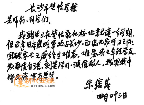 1944年2月,朱镕基总理就读于楚怡中学。他这一阶段的学习,很少有人知道。朱镕基在第一次湘西之行时,曾回忆道:“我当时在新化办的楚怡工业学校念了高中一年級,时逢长沙会战,长沙沦陷了。随后,国立八中到新化招生,我经考试转学到国立八中。1944年到1946年,随国立八中从新化、辰溪、泸溪、吉首辗转至永绥(原花垣)念了2年。”这正好与档案记录互相印证。在湖南私立楚怡中学的一份学籍档案上,有这样的记录:“民国三十三年高中一年二期,朱鎔基因受战事影响不能继续入学。”当时日本侵略军攻占长沙,国破家亡的感受令朱鎔基刻骨銘心。2001年4月9日,朱总理视察新化时,曾兴致勃勃地谈及此事。数年后,他在长沙市楚怡学校百年华诞时给学校发来了上面的这一封贺信,在信中他深情地回忆了在楚怡学校就学经历。