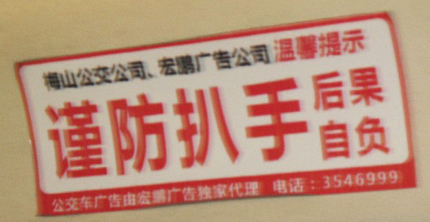 新化在线网讯( 通讯员 邱清疆 记者邱向明 ) 人们在上社会活动,不难看到有歧义的标语广告。元旦期间,记者在新化县城1路公交车上看到“温馨提示:小心扒手,后果自负。”此广告其用意是提醒乘客,小心扒手,如果不这样,后果自负,与车主无关。广告中的“后果”意为最后的结果(多用在坏事的后面)。记者认为既然小心扒手,就没有什么后果自负而言。只有不小心扒手,才有后果。上述广告应为“小心扒手,否则,后果自负。”“否则”这个连词,表示如果不这样的意思。加上它,广告就无歧义。
