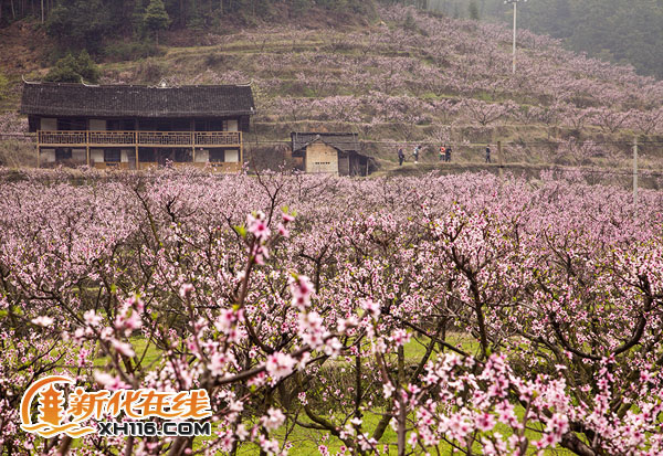 漫山遍野的桃花,远处几人是冷水江过来的游客